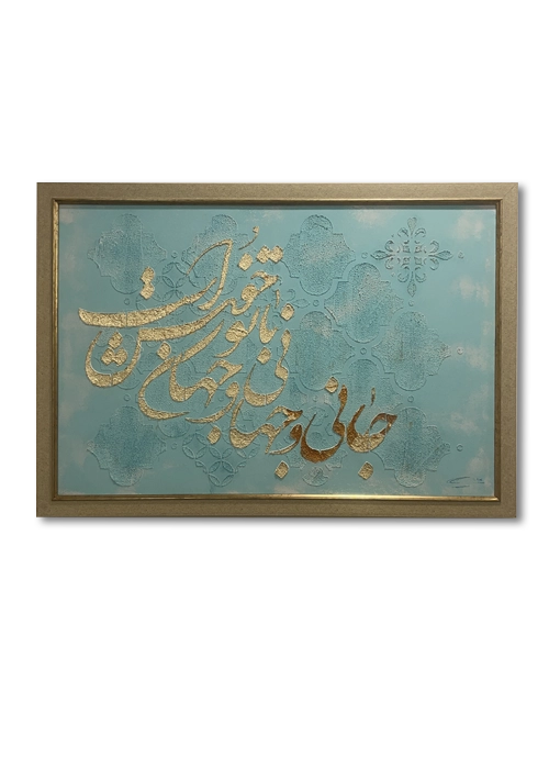 در این تابلو، بافتهای برجستهی تکسچر در کنار رنگهای کهنهکاریشده، حس گذر زمان و عمق تجربهی انسانی را القا میکنند. ورق طلا در بخشهایی از اثر درخششی ظریف و معنوی ایجاد کرده که همچون نوری در دل تاریکی، روح اثر را زنده میکند. کالیگرافی ظریف و موزون در میانهی این ترکیب، تداعیکنندهی وحدت میان «جان و جهان» است؛ مفهومی عرفانی که در شعر و اندیشهی ایرانی جایگاهی والا دارد.